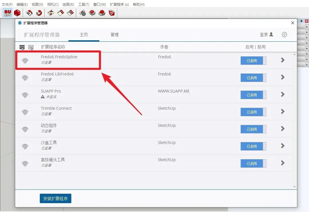 1.打开SketchUp—窗口—扩展程序管理器—安装扩展程序—点击插件
