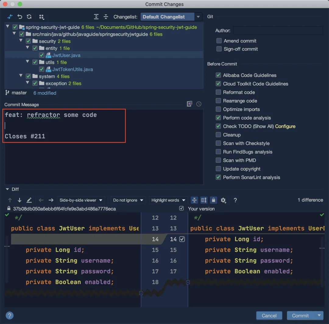 没有安装这个插件之前,我们使用IDEA提供的Commit功能提交代码是下面这样的:
