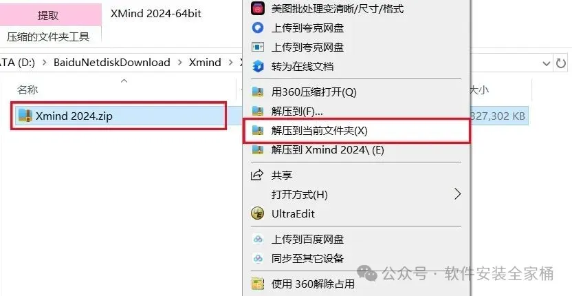 1.打开下载的Xmind 2024软件安装包,鼠标右击压缩包选择【解压到当前文件夹】。