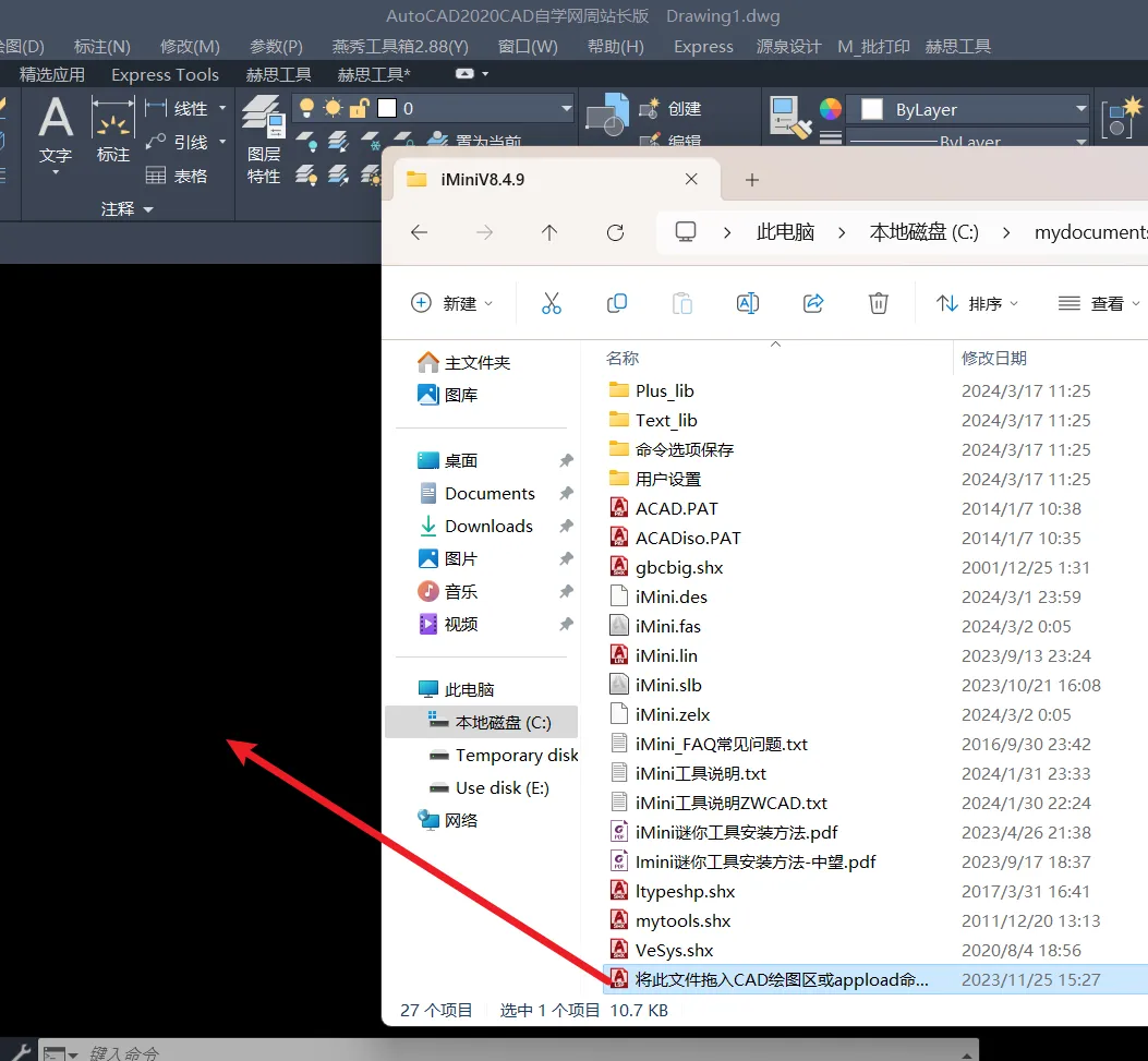 解压下载的压缩包,把解压后的文件夹放在固定位置,打开把如图所示文件拖入CAD绘图区;