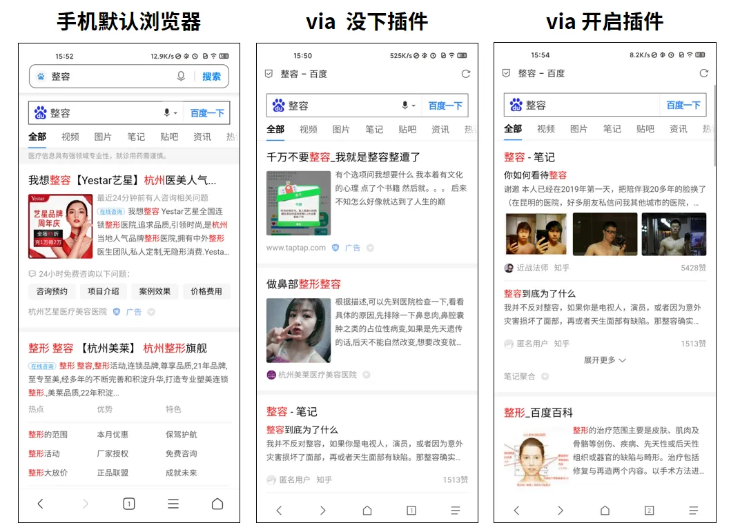而 via 在开启纯净苍穹插件后,不仅原来的强制跳转页面消失了,就连搜索结果也变得干净了许多。
