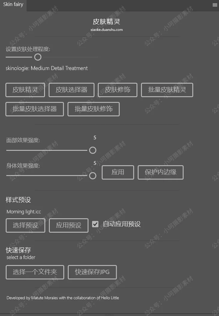 包括:皮肤精灵按钮——自动遮罩主体皮肤,并应用多个皮肤编辑作(由Skinologie策划),只需3次点击4个皮肤等级包括:轻度细节护理、中等细节护理、全细节护理、糟糕皮肤护理,所有内容在跑完皮肤精灵后均可100%调节皮肤选择按钮——自动创建主体皮肤的遮罩(并配合你自己的动作使用)批量皮肤精灵、批量皮肤选择器、批量皮肤学按钮——将上述流程应用到你打开的图片上面部效果强度 + 身体效果强度滑块——分别调整你对主体面部或身体的动作强度样式预设按钮——你可以在运行皮肤精灵之前选择(或创建)预设,它会在运行皮肤动作的同时将你的预设添加到图片中预设——包含3个细腻预设,你可以与皮肤精灵配合使用,为你的图像增添更多亮点快速保存按钮——只需点击一下按钮,将图片保存为jpeg格式