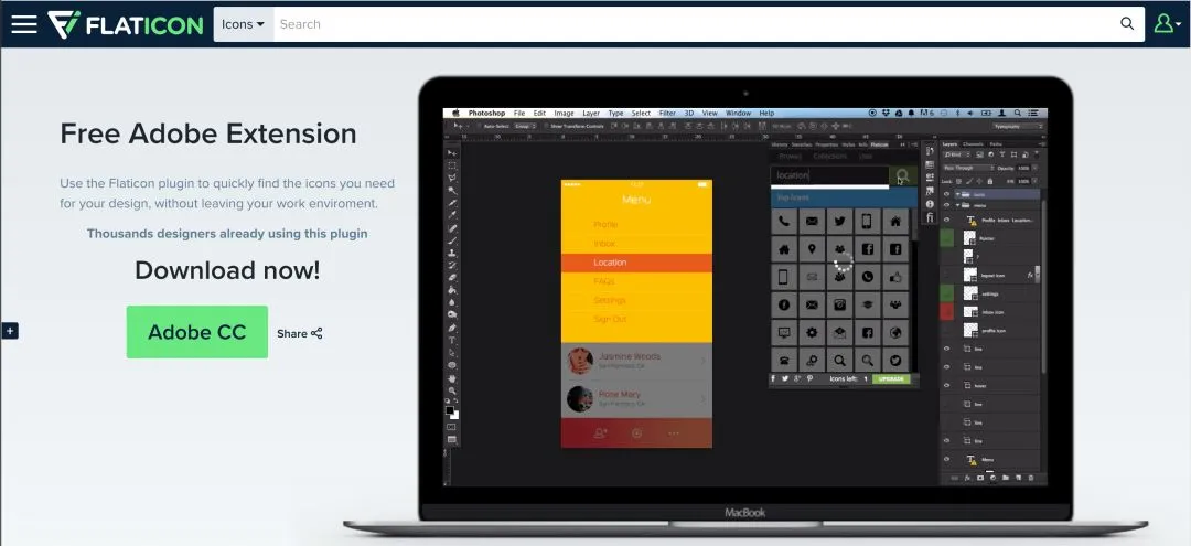 Flaticon 是一个可以为你提供免费矢量图标素材的 PS 插件,这些矢量的图标可以是SVG格式的,也可以是PNG,安装 Flaticon 之后,可以直接在 PS 中搜索它的图标数据库,并且直接将图标插入到你的设计当中。