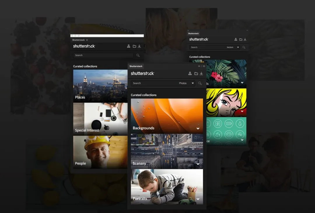 和 Pexels Plugin 类似,Shutterstock 也是一个非常强大的免费图片服务,通过它的PS插件,你能够直接搜索并获取免费甚至可商用的图片素材,避免走更长的设计流程。