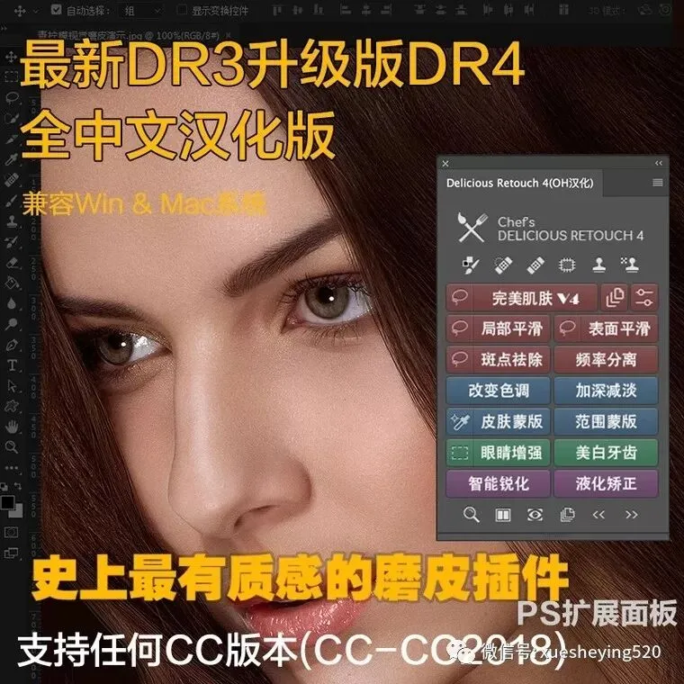 最新的人像美容扩展面板插件——DR4,为DR3 的升级版,功能更强大,速度更快,运行稳定,效果要比Portraiture插件好。
