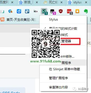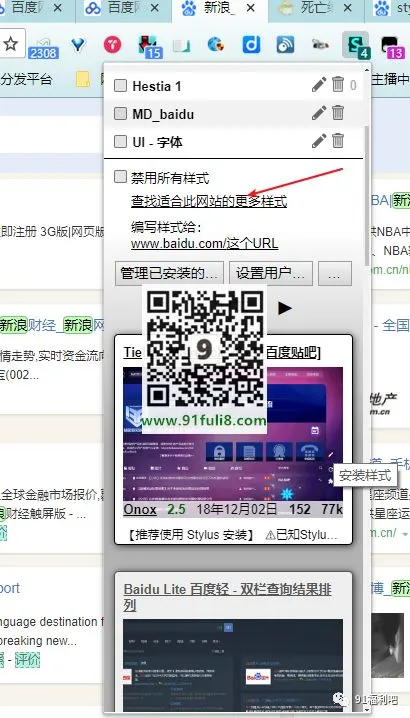 好了,了解了stylus插件基本概念后,我先给出下载地址,会fq的同学直接谷歌商店搜索stylus,或者关注微信公众号’91福利吧’,回复关键字’cj1381’获得插件crx文件。或者https://www.gugeapps.com/webstore/search?key=stylus下载都可以。安装好了之后,插件栏会多‘S’的标识。当你浏览某个网址,需要进行改造,点击S标识,查找更多样式。具体如图