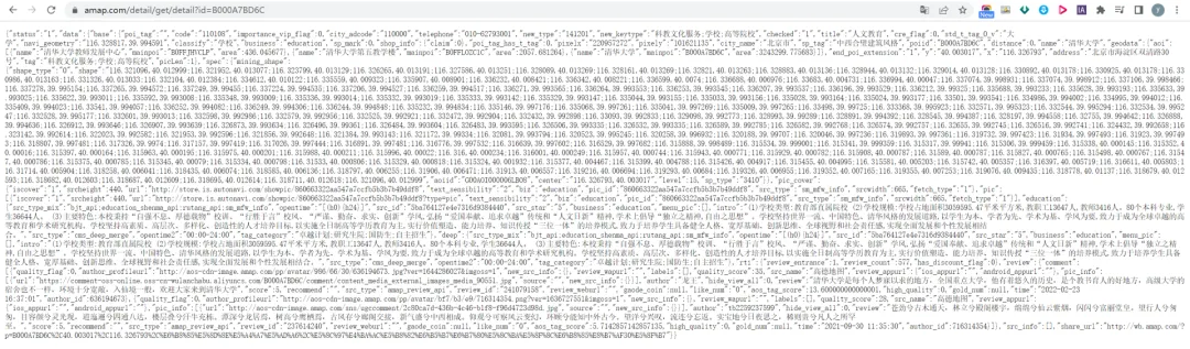 将这个改造好的地址https://amap.com/detail/get/detail?id=B000A7BD6C复制到浏览器中,就可以获取一串信息。
