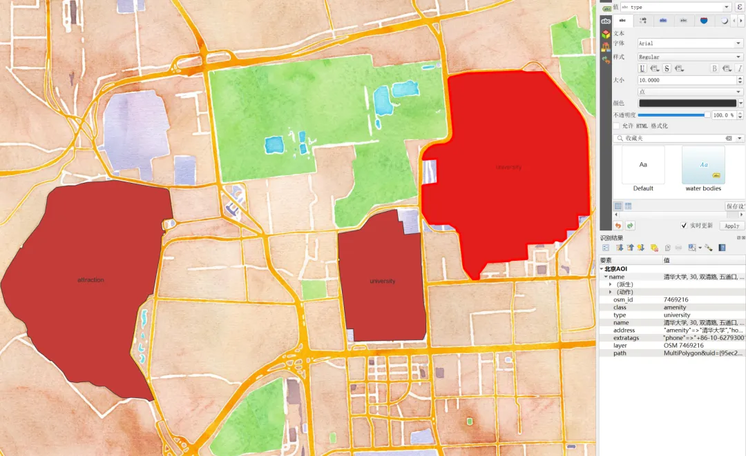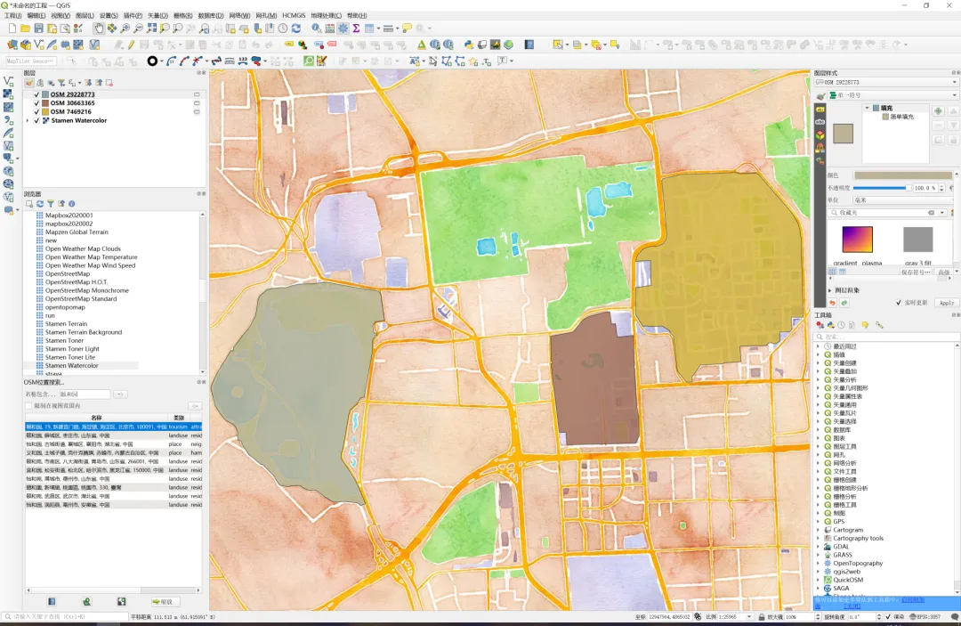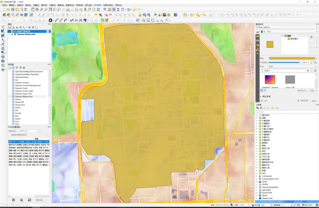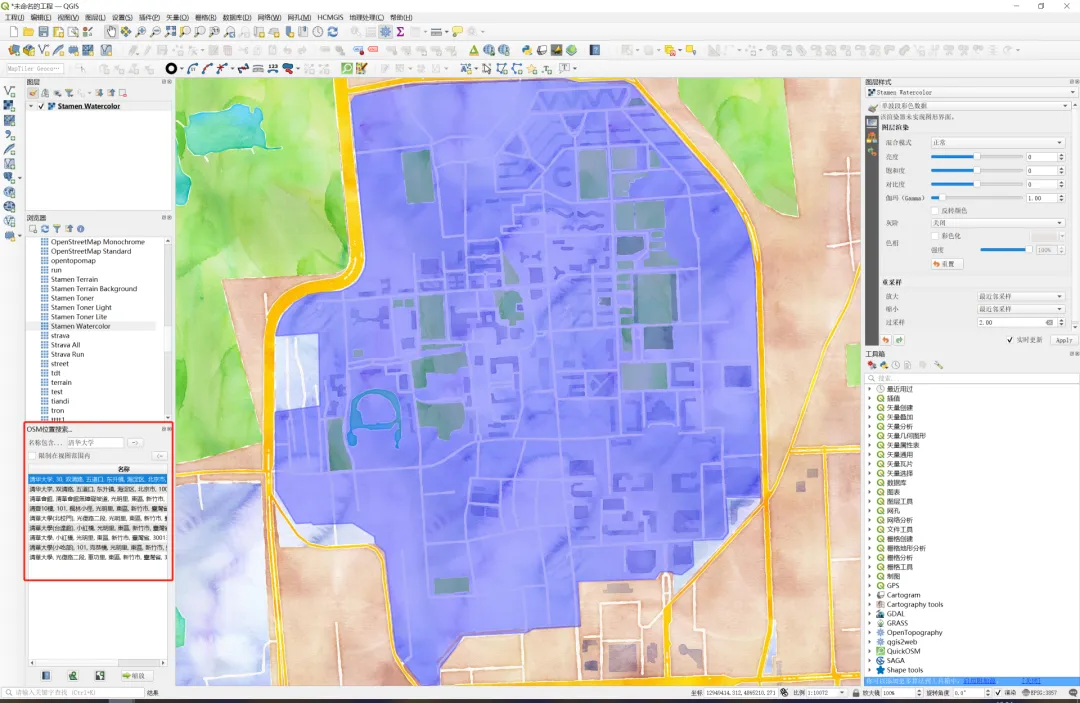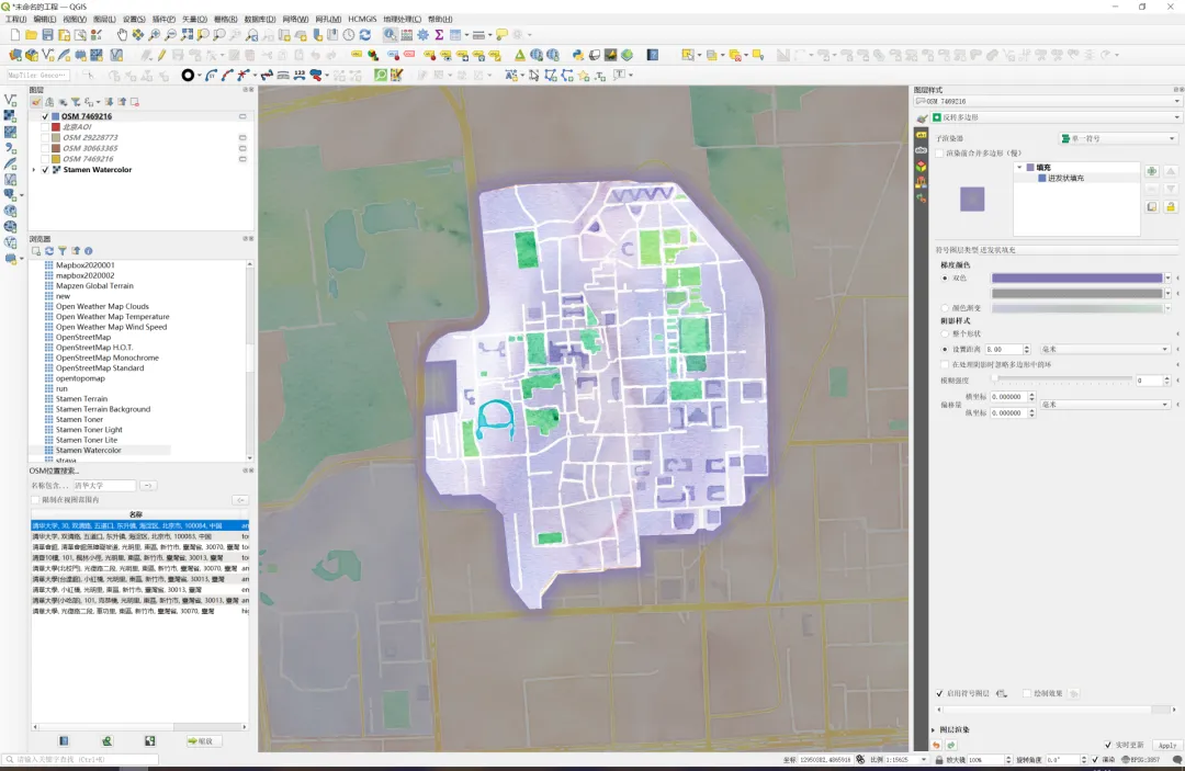 安装完毕后,会多出一个OSM位置搜索的面板,在搜索框中直接输入关键字进行搜索即可,比如通过清华大学可以检索到多个有关清华大学的查询结果,鼠标移动到对应的结果上可以在地图上将其形状进行绘制,如果结果不在当前地图窗口,双击结果可以进行定位。