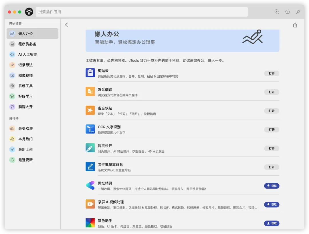 里面内置了超多办公工具,支持文件批量命名,聚合翻译,剪贴板,OCR文字识别,各种图片处理,屏幕录制···,这对于其他一些软件,你可能需要单独下载,或者需要收费才能实现。