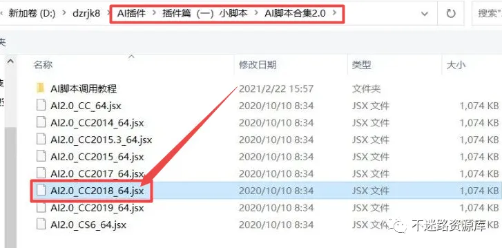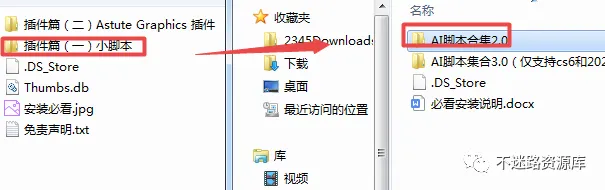 2.打开刚刚解压的文件夹,依次打开”插件篇(一)小脚本——AI脚本合集2.0″(3.0版本仅支持CS6和2020版本的,因为我的AI是2018版本的,只能用2.0的合集,所以示范2.0的,如果你的版本是CS6或者2020的话就打开3.0,安装方法是一致的)