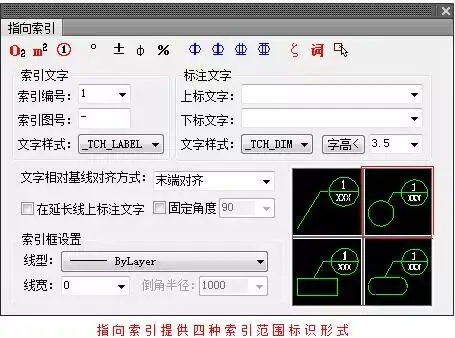 索引符号拆分为指向索引和剖切索引两个独立的命令,指向索引新增两种索引范围标识形式;剖切索引在高级选项中增加默认剖切线宽度以及剖切线距引线端头距离两项参数;