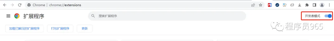 打开Chrome浏览器,地址栏输入:chrome://extensions/ 进入扩展程序页面,打开右上角开发中模式。