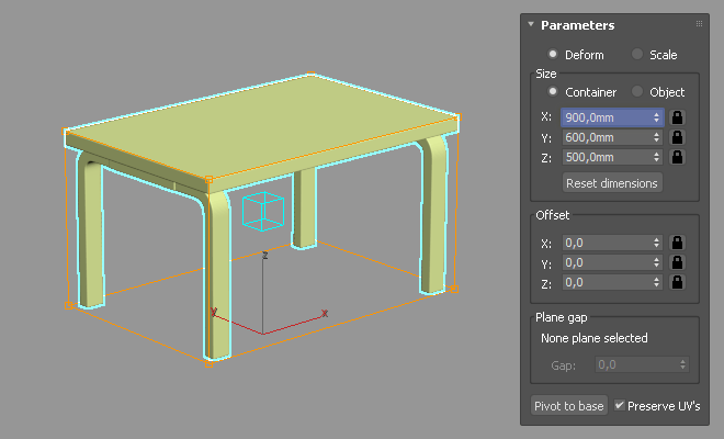 选择需要保持比例的部分,ReDeform需要定位X,Y和Z平面子对象。缩放操作发生在Gizmo平面任一侧的第一个定点之间。也可以将平面扩展为矩形用来锁定封闭区域。也可以通过一个类似FFD修改器的功能重新缩放物体。为了防止UVW贴图在缩放时变形,还有一个贴心的Preserve UVWs(保留UV)选项。
