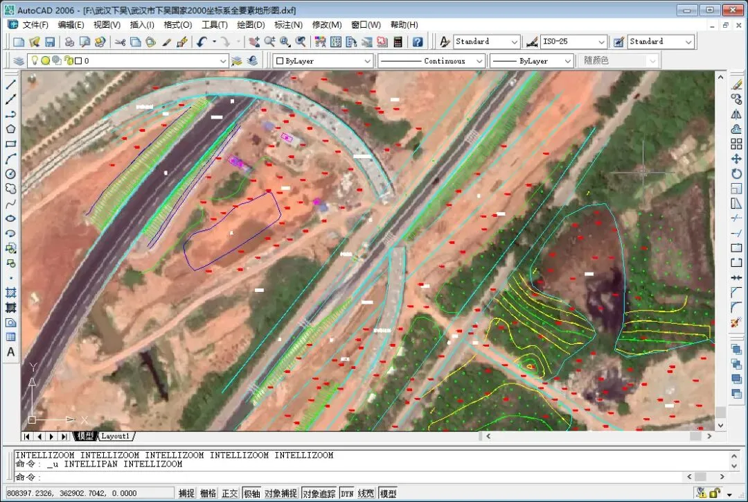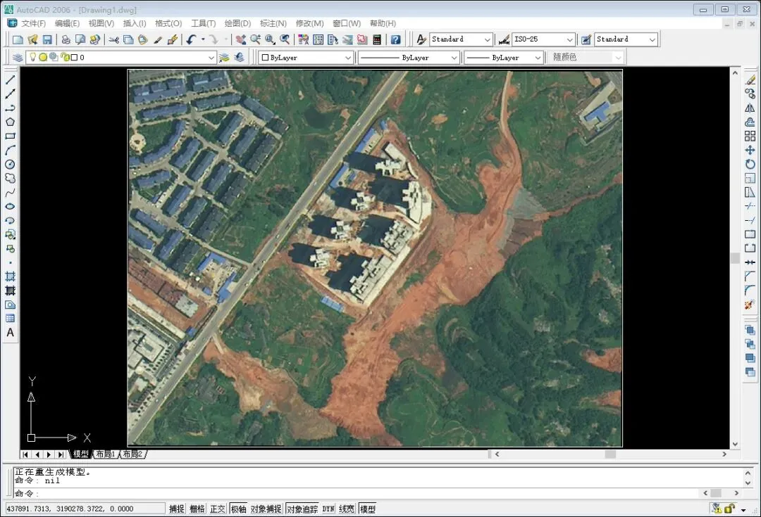 现在,我们就已经将卫星影像插入到CAD中了,而当前显示的坐标则为下载影像时选择的西安80坐标。