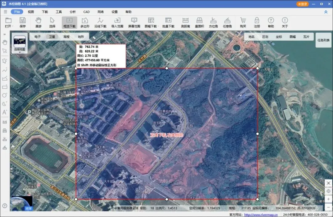 在水经微图中,我们可以通过“框选下载”工具选择需要下载的目标区域,然后双击目标区域可以新建下载任务。