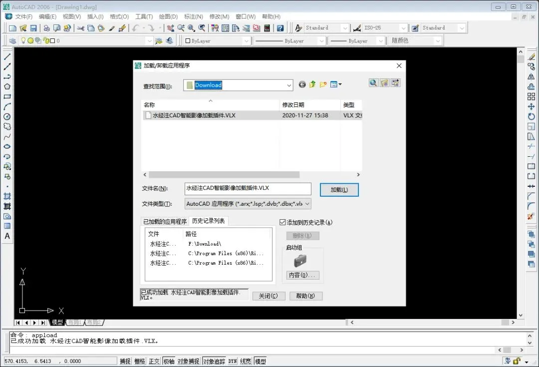 选择CAD插件文件后,点击“加载”按钮,在CAD命令行会提示已成功加载的信息。