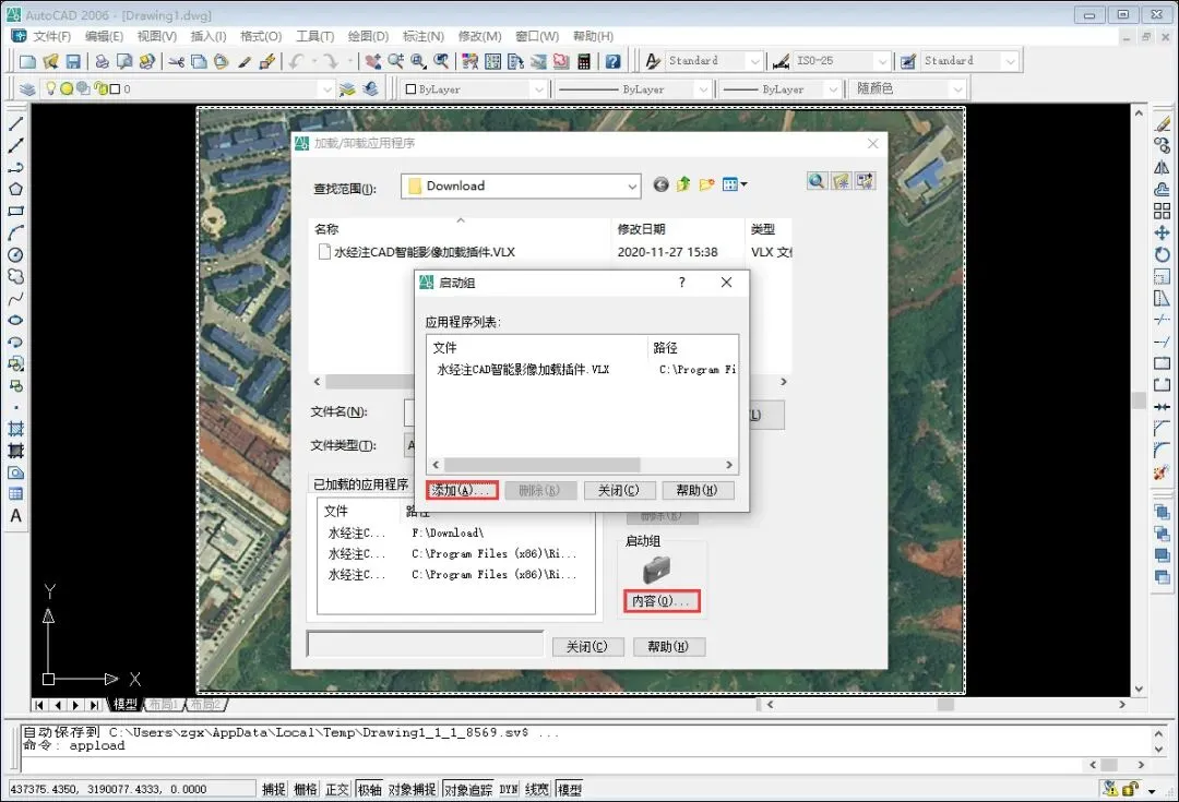为了避免每次加载插件,可以在加载对话框中点击“内容”按钮,然后将插件添加到启动组中,以后就只需要输入“aimg”命令即可加载卫星影像。