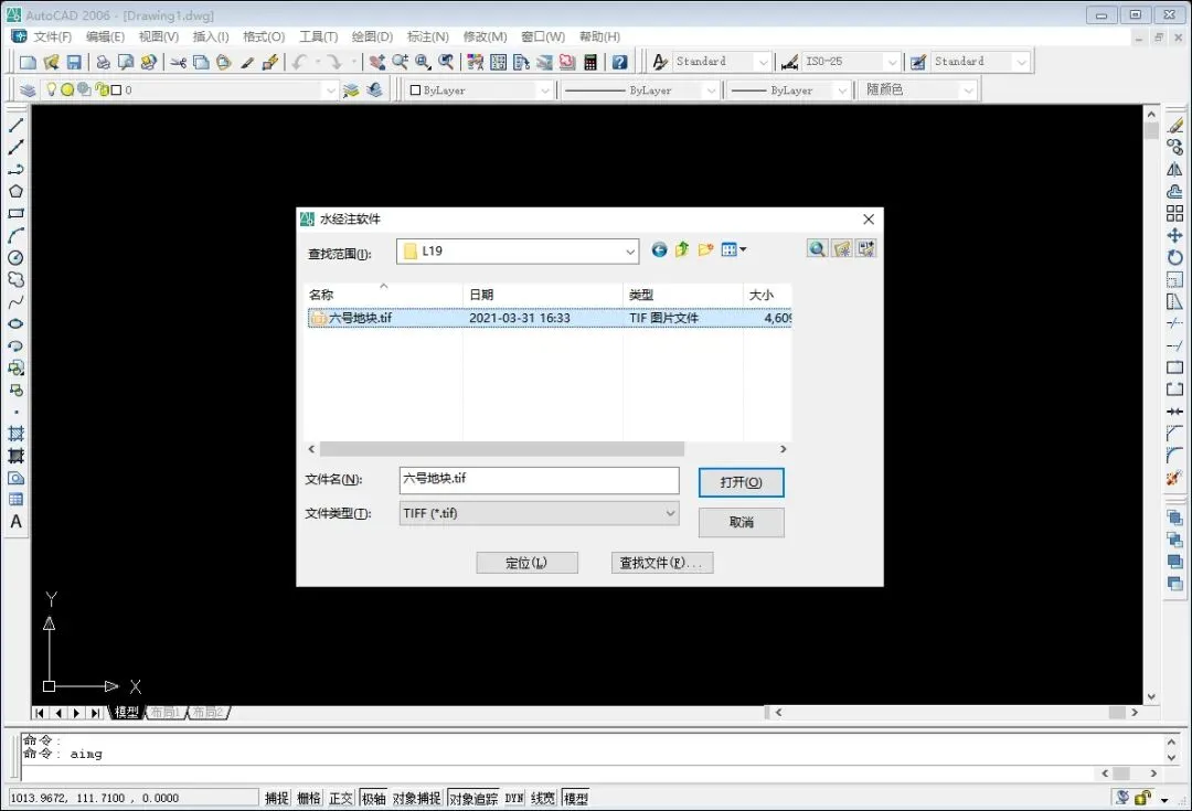 在CAD命令行中输入“aimg”命令(AttachImage的简写),然后选择下载好的卫星影像图片文件后,点击“打开”按钮可将图片插入到CAD中。