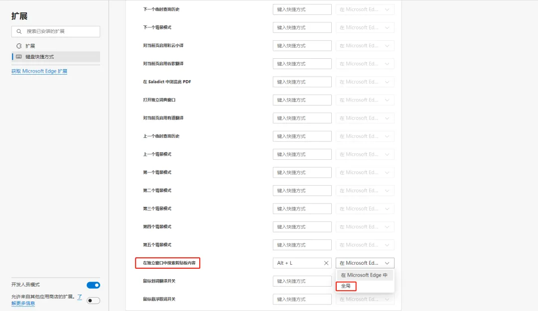 我们需要在浏览器内为沙拉查词设置全局快捷键,以edge浏览器为例,直接输入:edge://extensions/shortcuts;