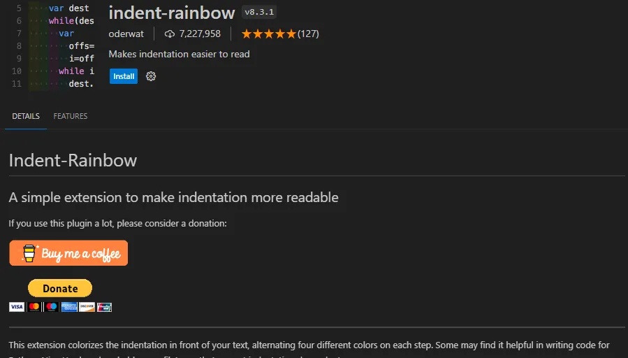 官方地址:https://marketplace.visualstudio.com/items?itemName=oderwat.indent-rainbow
