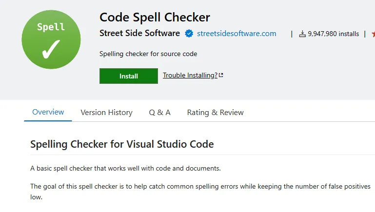 官方地址:https://marketplace.visualstudio.com/items?itemName=streetsidesoftware.code-spell-checker
