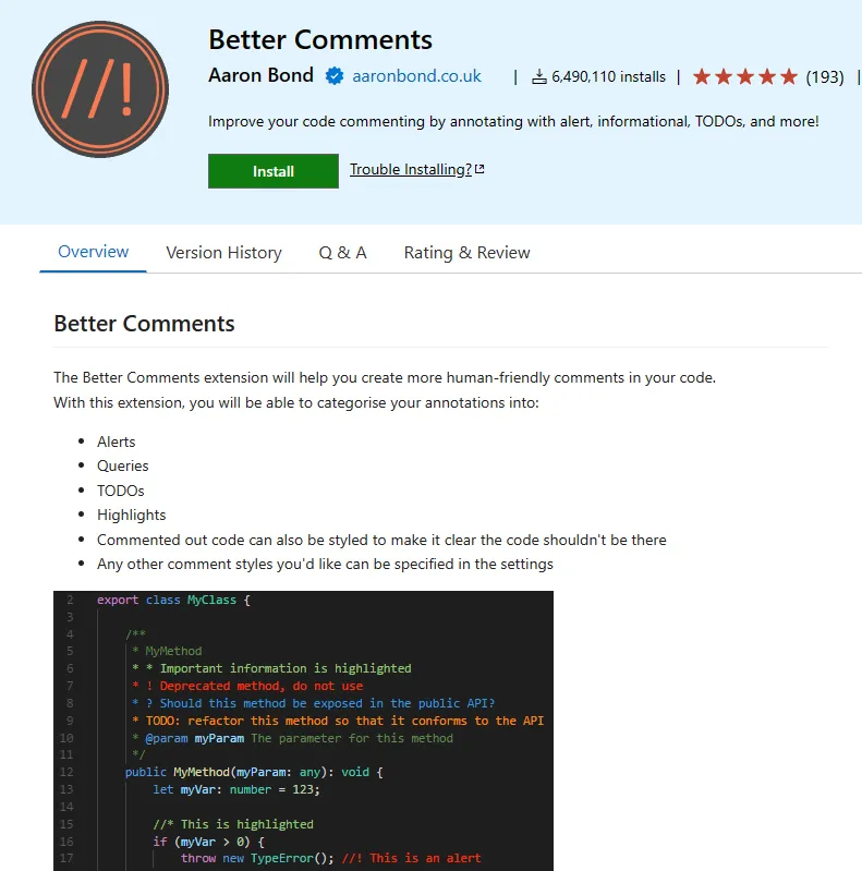 官方地址:https://marketplace.visualstudio.com/items?itemName=aaron-bond.better-comments