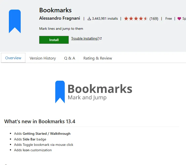 官方地址:https://marketplace.visualstudio.com/items?itemName=alefragnani.bookmarks