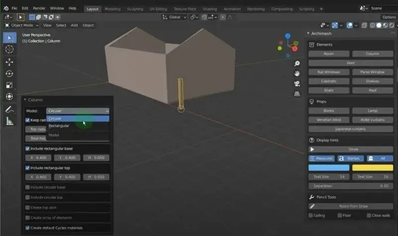 这个插件可以用非常简单的方式为3D场景创建房间,只需添加一个新网格,选择Archimesh,就会看到一个简单易用的菜单,在这里更改房间的所有设置,包括墙壁的数量、长度、地板和天花板。