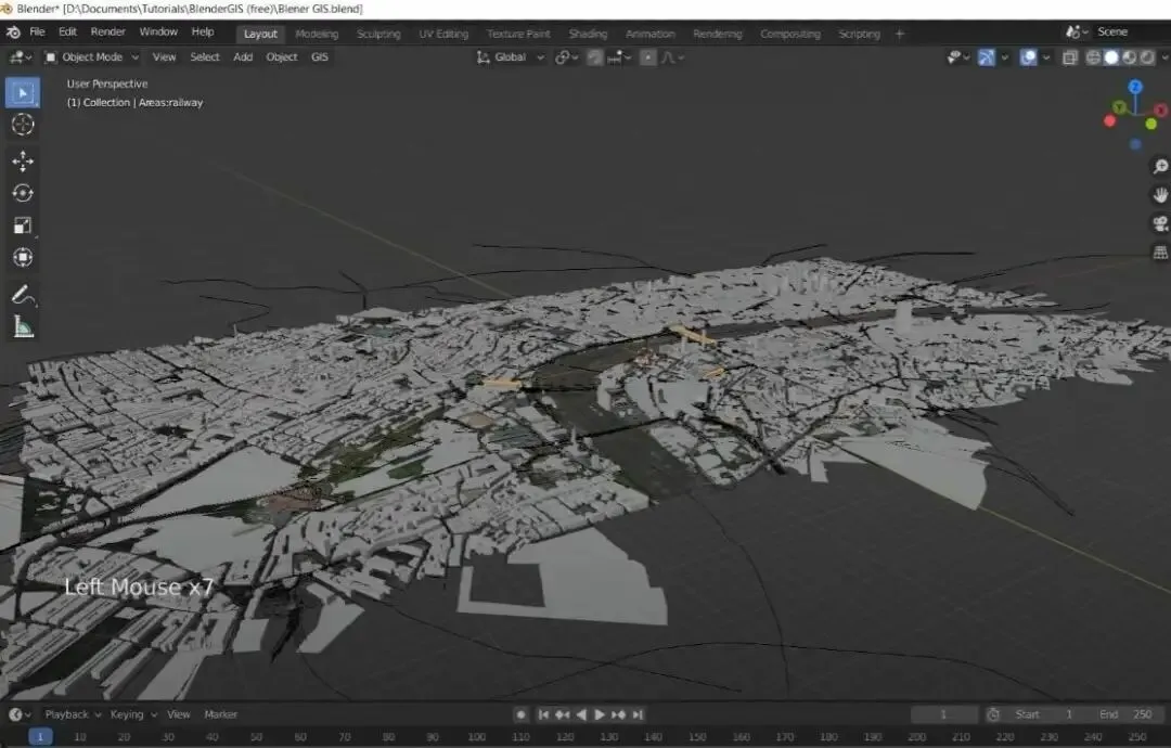 除了插入地图外,BlenderGIS还提供了地图的自定义功能,如高程和位移。还可以在GIS地图中添加自定义的3D对象,如建筑物或树木,这项功能对于根据真实地点创建详细的3D场景非常有用。