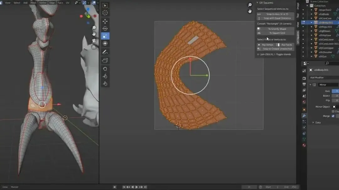 UV Squares插件包含多个有用的功能,可简化Blender中的UV贴图。其中有一个功能是将选定的UV面重塑为方形网格。这一功能非常好用,特别是在处理需要细致调整UV来确保纹理不变形的复杂模型时。