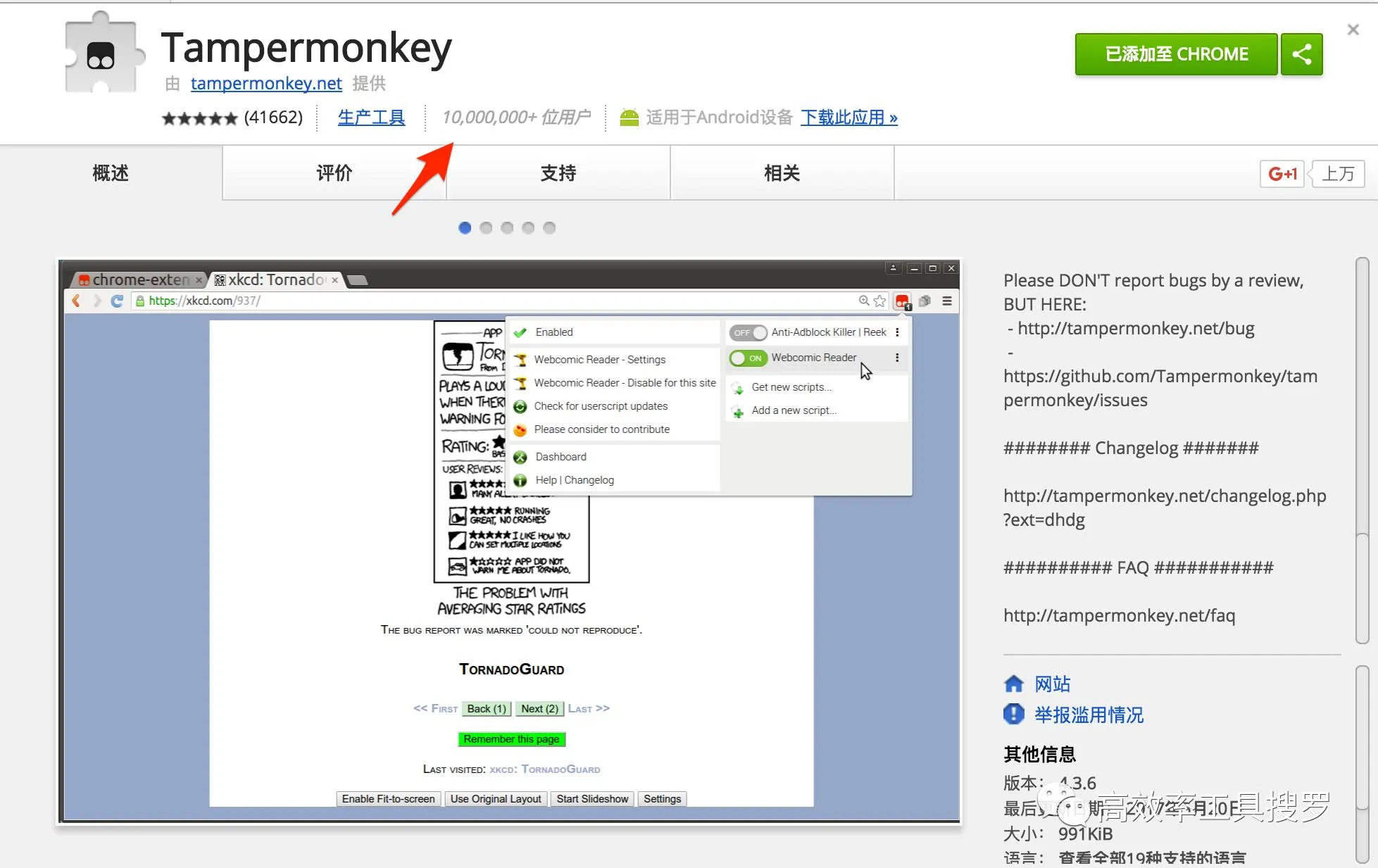 我们来看一下,它在Chrome 插件市场已经1000 w+ 的下载了,也看出它的受欢迎程度。
