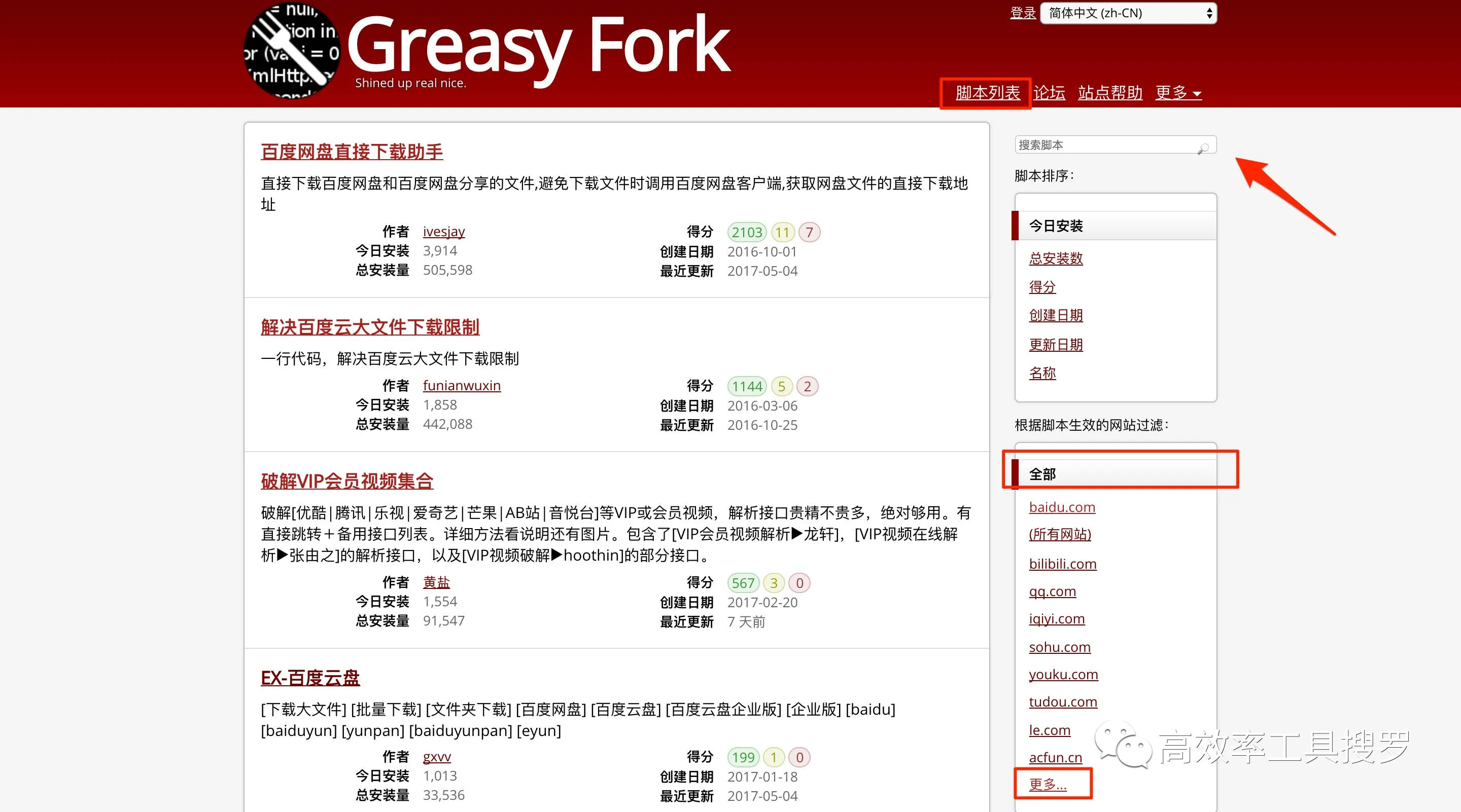 右下角的【全部】,它罗列了不同网站的脚本,你可以点击【更多】查看所有的网站。