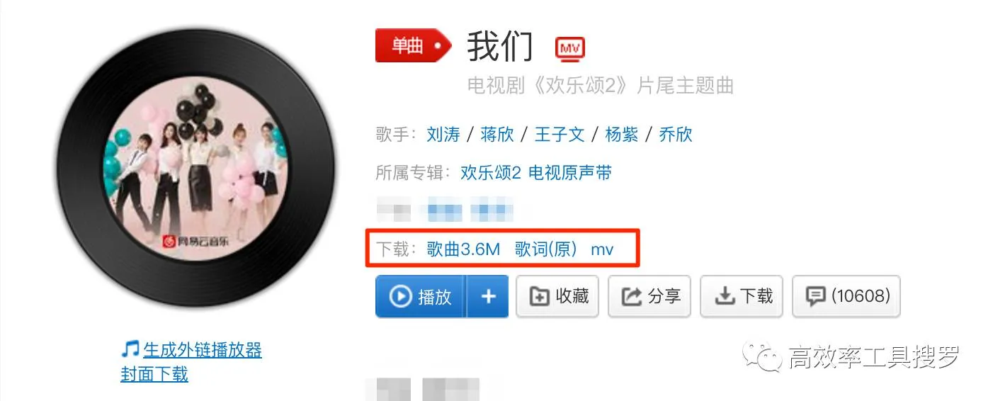 我们可以看截图,在播放按钮的上面,多了下载一排按钮,你可以下载歌曲,歌词和MV。