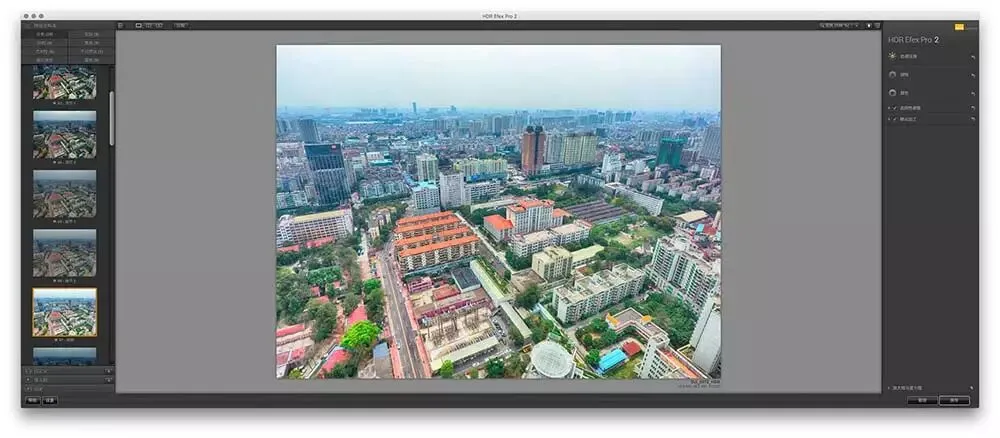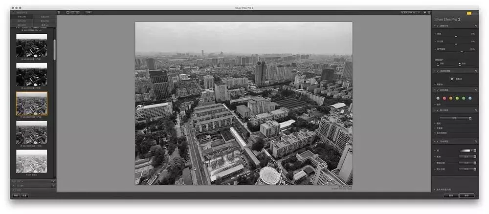 界面左侧是内置的滤镜,也支持自定义预设,大家也可以在右侧手动调整各项参数。我使用 HDR Efex Pro 2 的 07 号 “鲜明” 滤镜还有 Silver Efex Pro 2 的 005 号 “高细节强度(严格)” 滤镜处理了一张航拍照片,大家可以在下面这张图片中对比一下和原图的区别。