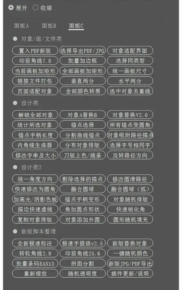 全新AI(illustrator)脚本插件合集Pro版3代,此插件支持AI 2017~2024版本且Win/Mac通用!内含了182+个AI脚本(2代是170个)。本次更新,新增了全新极速标注、批量条码、印前角线、一键随机填色等脚本。