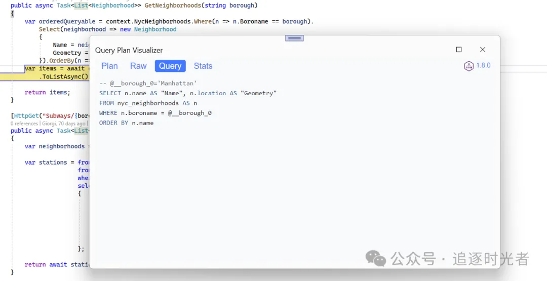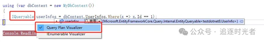 注意注意:该插件只支持检查IQueryable变量,不支持List变量,只有IQueryable变量才会展示Query Plan Visualizer 按钮,无法在Visual Studio中检查中间值!!!