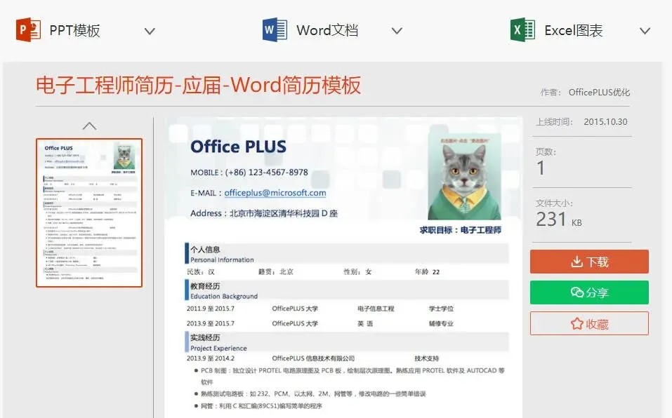 PPT模板包括:总结/报告、项目策划、产品推广、学术答辩等。Word文档包括:求职简历、常用合同、党团文章等。Excel图表包括:财务报表、办公表格、常用工具等。