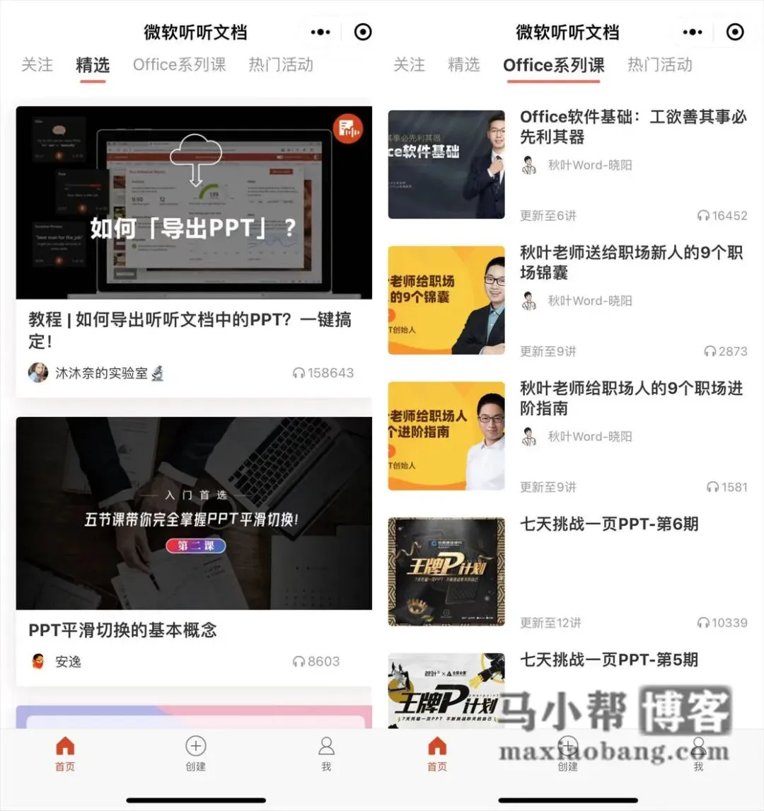除了以上的模板资源微软还推出了一款小程序:微软听听文档,里面包含了非常多的Office系列课程,教你如何更好的使用office软件,让你的PTT制作越来越精美!