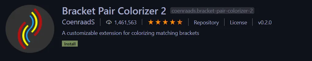 还好有它——BracketPair Colorizer 2!这是一款在vscode上拥有五星好评的王者软件,为代码中的各种结对的括号兄弟们提供了颜色高亮等功能。