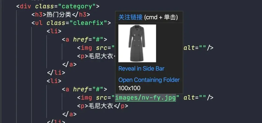 此外,如果已经知道类名或ID名,Csspeek还可以在你的html中鼠标指向某个class或者id名称,按住Ctrl键+鼠标左键可以直接定位到该名称的CSS的位置,并快速跳转到正确的CSS/SCSS/LESS代码,可以说是大大提高了开发效率。