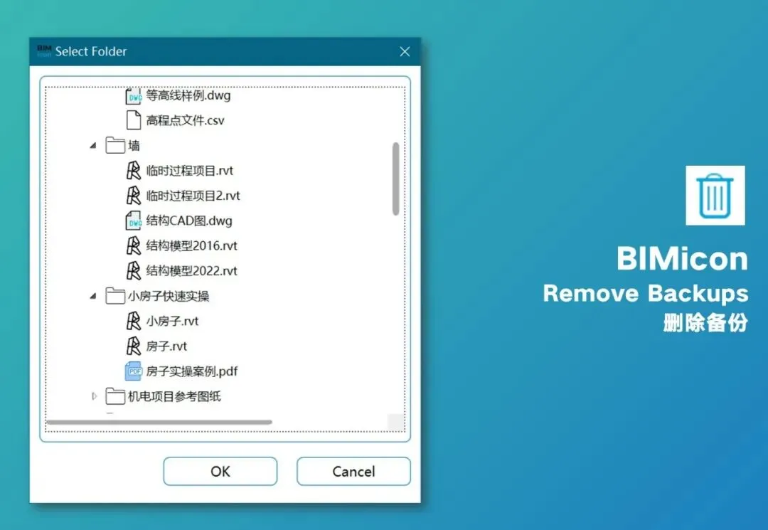 使用删除备份功能,你不需要在硬盘里四处找,只需要在Revit里运行程序,找到想处理的文件夹,就可以批量删除所有的备份文件了。