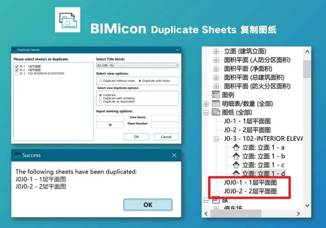 很多人现在都会在Revit里生成图纸,再批量导出到CAD里修改,一张一张地创建图纸、插入视图还是挺麻烦的工作,这个功能可以让你基于已有的图纸来批量创新新图纸,你可以设置图框,选择是否复制图纸里的视图,也可以自定义图纸的编号和前缀,新的图纸就按照你的需求创建好了。
