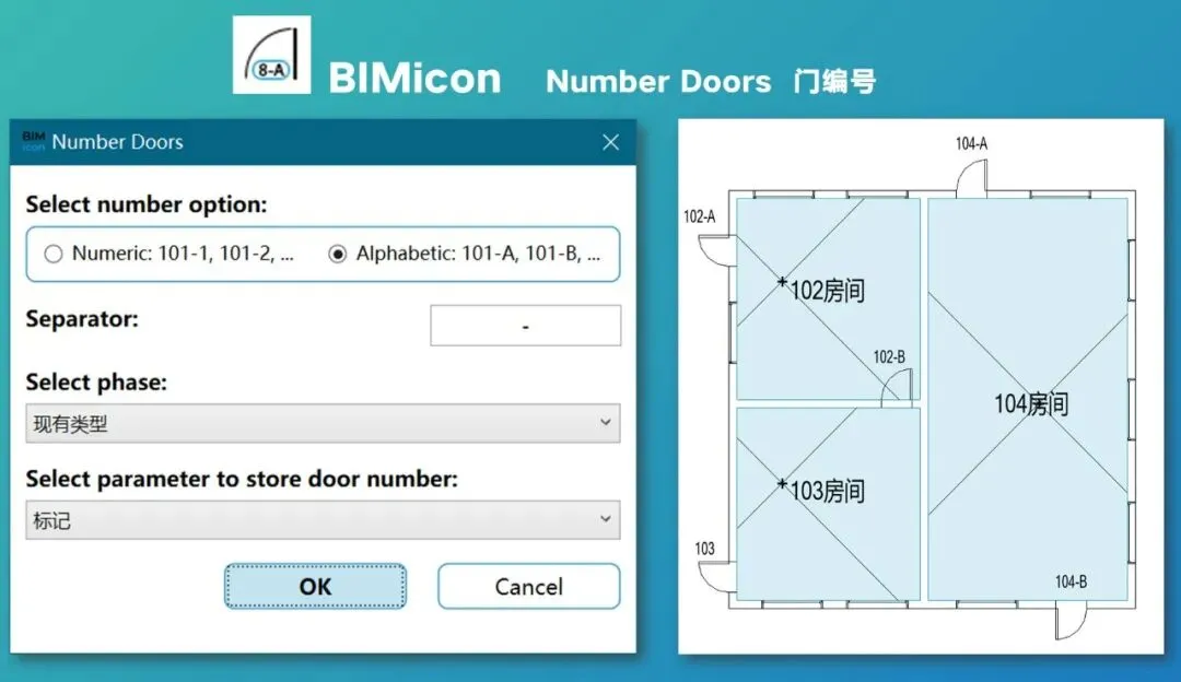 建筑建模的时候,「房间」是一个很好用的东西,很多国外的插件都是围绕着它来开发一系列自动功能的。这里的自动门编号也是基于房间信息,你可以选择是用阿拉伯数字还是英文字母生成编号,编号会自动跟随房间来命名,当然你也可以自定义编号的前缀。