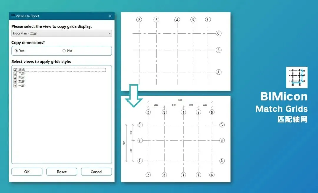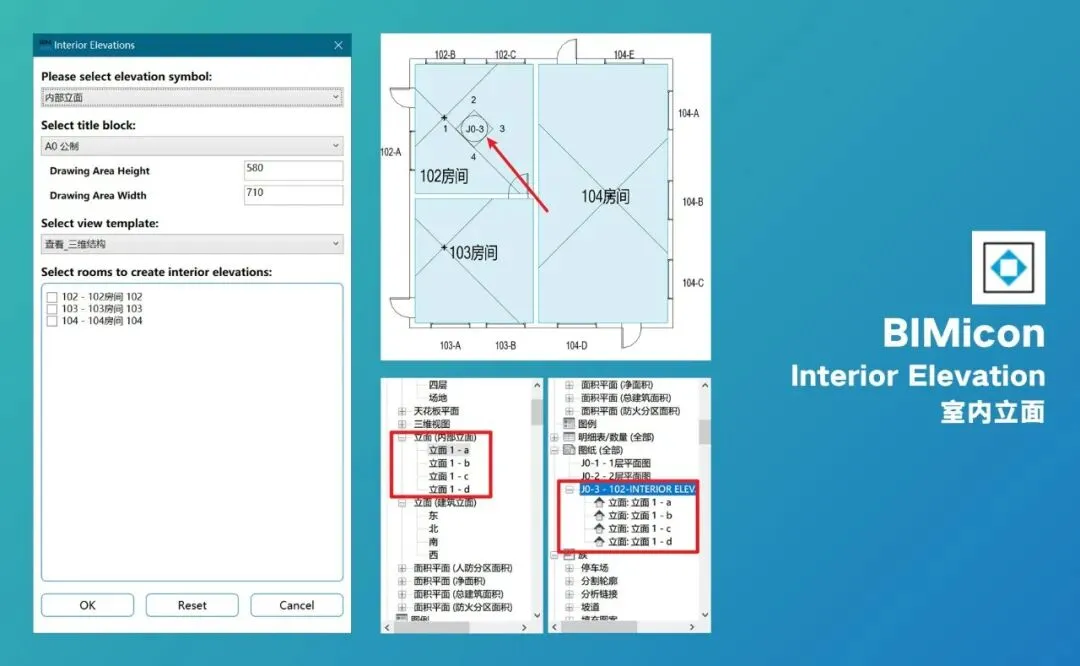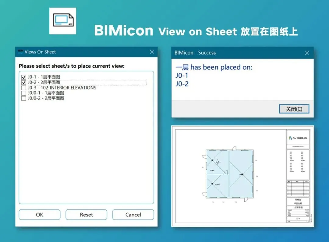 一般咱们创建图纸的时候,都是先把空白的图纸建立出来,再通过下拉菜单一个个插入视图,BIMicon提供了一种更符合直觉的工作方式,你可以在操作任何视图的情况下,不打开图纸,直接通过这个功能把当前的视图插入到选定的图纸里,也可以批量多选图纸,比如把某个详图批量插入到多张平面图里,再和前面说的复制图纸功能结合起来,效率就更高了。