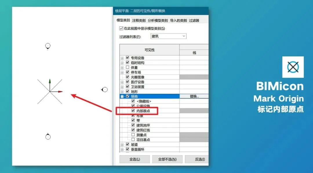 不过在Revit 2020.2这个版本之后,可以让内部原点显示出来,位置就在视图的可见性设置里,找到「场地」,展开后会看到内部原点、测量点和项目基点,都可以独立设置是否显示,使用高于这个版本的小伙伴就不需要这个插件功能了。
