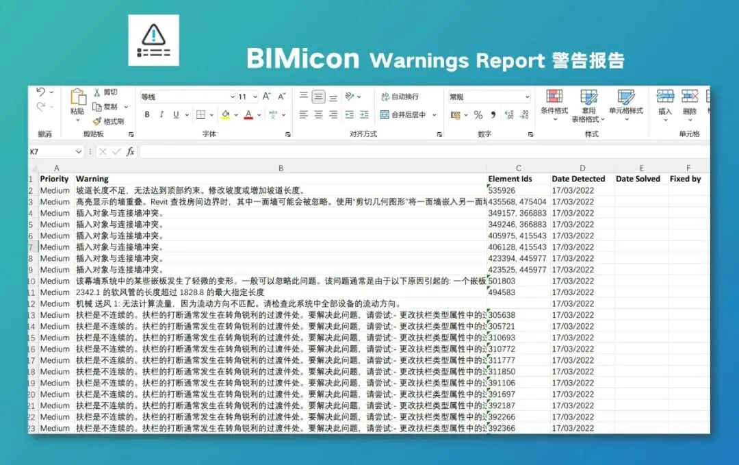 在使用Revit做项目的时候,软件会给出一些错误警告,比如栏杆不连续、坡道长度不足、连接点冲突等等,能帮助设计师排查错误,BIMicon提供了一个批量导出错误警告的功能,按照警告的等级排序,还加入了负责人选项,方便团队分工解决问题。