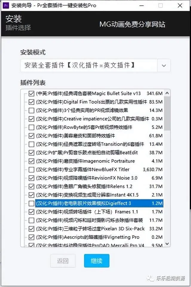 4. 需要安装什么插件就勾选哪个插件,大家可以按照自己需求进行安装,然后点击“继续” 软件就会自动进行安装了,温馨提示:如果你的电脑配置低不建议全部勾选所有插件,因为你的电脑配置低勾选所有插件安装会造成打开软件时会造成崩溃