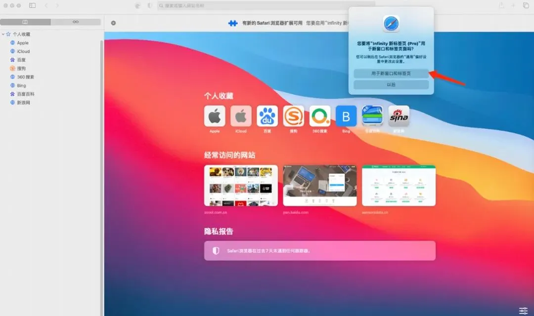 与在Chrome浏览器上一样,完成上述步骤后,Safari浏览器主页及新标签页都会自动被替换为Infinity了。
