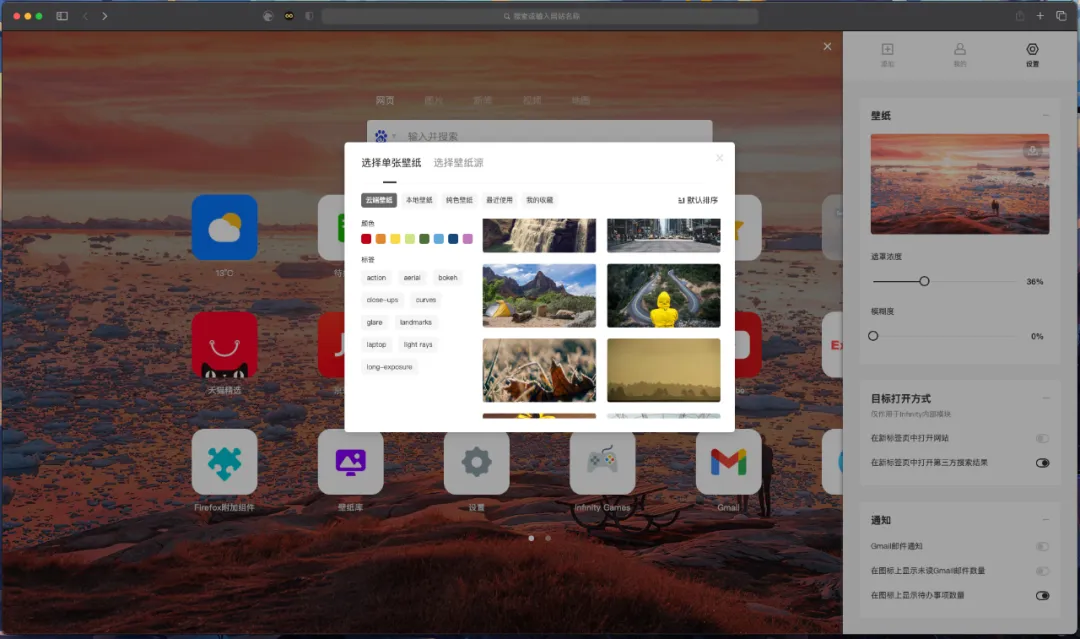 Infinity内置多个海量高清壁纸源,包括 Bing 每日壁纸、Unsplash、LifeOfPix 等。