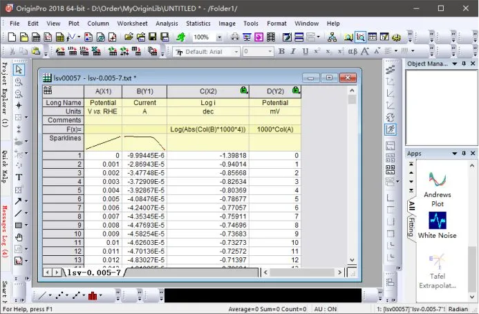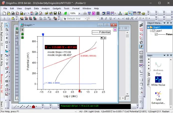本期要介绍的插件是 OriginLab 官方技术支持团队提供的 “Tafel Extrapolation” 插件,该免费插件主要可用于估算 Tafel Extrapolation,并输出相应的参数值(如阳极/阴极曲线函数、腐蚀电位和电流、阳极/阴极曲线斜率和角度)。插件支持的最低Origin版本为Origin2016(9.3)。